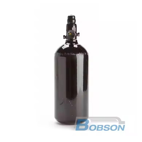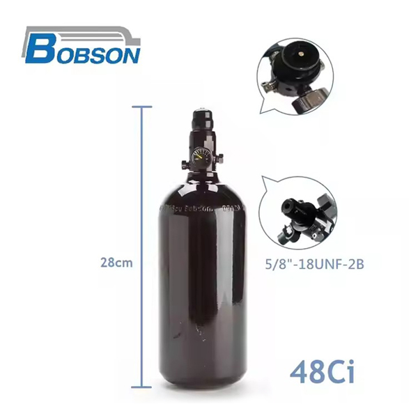 RHO certified 790ml (48ci) aluminum cylinder for paintball and airsoft guns, rated for 3000 PSI. This refillable PCP tank comes with a regulator, offering consistent and reliable performance for high-pressure air applications. Made from durable, lightweight aluminum, it is designed to ensure optimal efficiency and safety for paintball and airsoft systems.